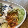 Ожидание заказа более 30 минут! Были шокированы с учетом того, что это не ресторан, а точка на фудкорте. Тарелки делится... на блюда с курицей и блюда с говядиной. Говядины нет в наличии в 15 часов дня. Курица в грибном соусе в целом нормально. Салат на картинке красивее и другой состав